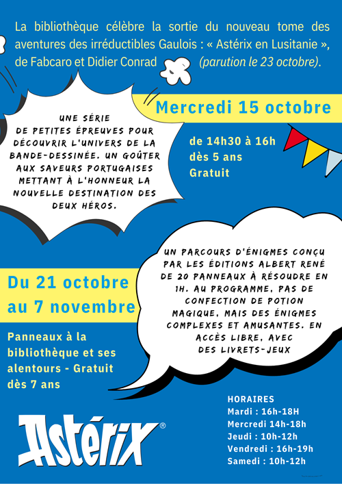 La bibliothèque de Saint-Pierre-le-Moûtier célèbre la sortie du 41e tome des aventures des irréductibles Gaulois : « Astérix en Lusitanie », de Fabcaro et Didier Conrad (parution le 23 octobre prochain). Les deux célèbres héros de la bande-dessinée font leurs valises pour visiter de nouvelles contrées. En écho à cette parution, deux animations sont proposées :